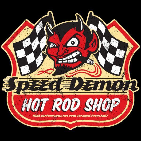 Speed demon hot rod shop logo available on black t, shirts... See more ideas about shop logo, vintage logo, garage art.